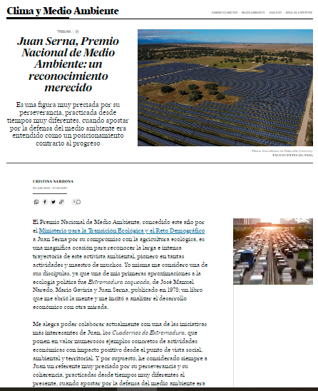 El Premio Nacional de Medio Ambiente, concedido este año por el Ministerio para la Transición Ecológica y el Reto Demográfico a Juan Serna por su compromiso con la agricultura ecológica, es una magnífica ocasión para reconocer la larga e intensa trayectoria de este activista ambiental, pionero en tantas actividades y maestro de muchos. Yo misma me considero una de sus discípulas, ya que una de mis primeras aproximaciones a la ecología política fue Extremadura saqueada, de José Manuel Naredo, Mario Gaviria y Juan Serna, publicado en 1978; un libro que me abrió la mente y me incitó a analizar el desarrollo económico con otra mirada.
