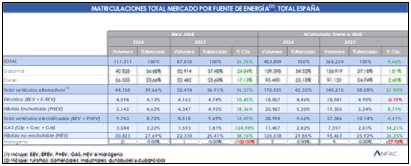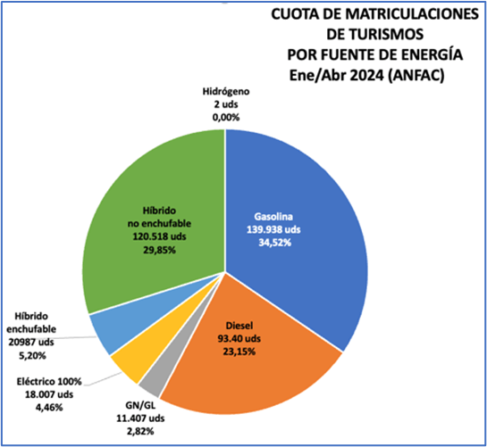 El título de este texto, que ha aparecido como titular en diferentes medios, muestra una realidad que requiere algún análisis a fin de identificar los porqués y las tendencias futuras. Las cifras de esta realidad se exponen en los siguientes gráficos. En los cuatro primeros meses de 2024 se produjeron más de 400 000 matriculaciones de automóviles que supusieron un crecimiento del 9,7 % respecto al mismo periodo del año anterior. Sin embargo, el sector de turismos electrificados (PHEV híbridos enchufables + BEV eléctricos 100 %) creció el 4,4 %. Si se ponen estas cifras en contexto, este sector solo representa el 9,7 % de cuota del total del mercado.