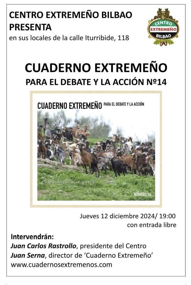 A las 19:00h del jueves 12 de diciembre de 2024, el Centro Extremeño Bilbao presenta, en sus locales de la plazoleta de lo más alto -n.º118- de Iturribide (Metro: Santutxu – salida: Karmelo) el n.º14 de «Cuaderno Extremeño para el Debate y la Acción» con la intervención de su presidente, Juan Carlos Rastrollo Díaz, y del director de la revista, Juan Serna Martín, reconocido experto en agricultura ecológica, gestión del agua, medioambiente y desarrollo rural.